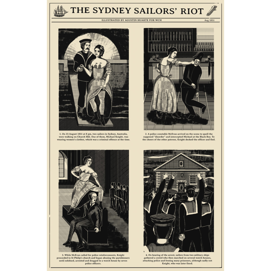 Ezen a napon, 1851. augusztus 23-án erőszakos zavargás tört ki az ausztráliai Sydneyben, amikor a rendőrség megpróbált letartóztatni egy női ruhát viselő matrózt, Michael Knightot. A helyi lakosok ujjongása közepette Knight leütötte az őt letartóztatni próbáló rendőrt, és a templom felé vette az irányt. Ott megzavarta az istentiszteletet, és szidalmazni kezdte a híveket; végül a kiérkező rendőröknek sikerült letartóztatniuk. Knight őrizetbe vételének hírére több száz matróz gyűlt össze: megtámadták a rendőröket és a rendőrőrsöket, és az összes foglyot kiszabadították.